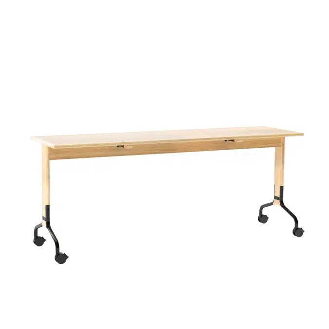 • The tabletop is made of veneered MDF, finished in oak, ash, birch, standard stains on ash, or white glaze on oak or ash. The centre beam and ends are of solid wood in the same finish as the top. The edge of the table top (straight as standard and D-kant for a supplement) will be the same finish as beam and ends. Table legs terminate in a metal foot with a finely textured powder lacquer finish in white (RAL 9016), black (RAL 9005) or grey (RAL9006/07). Each table is fitted with four black wheels that can be locked in place. Link fittings, table aprons and various electric outlets are available as optional extras. Tables equipped with electric outlets have cable ducts with a wooden finish, so cables can be kept in place under the tabletop when the table is folded for storage. The table is supplied unassembled. The leg frames are to be fitted to the central beam. If required, the table can be easily dismantled into its component parts using only simple hand tools.