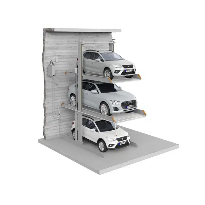 Triple stacker – A flexible parking solution for retrofitting. SingleUp3015 – Garage with Triple stacker made easy. SingleUp3015 is the simple and affordable way to turn one parking space into three – simply by stacking them on top of each other. The premium parking solution is installed without a pit. This means it can be adapted to the available space at any time. This means that additional parking spaces can be created in existing buildings. As is usual with dependent parking, the lower and middle parking spaces must be free to lower the platform for the third car. The system is therefore ideal for using the upper platform for long-term parking, such as classic cars, and the lower parking space for short-term parking.