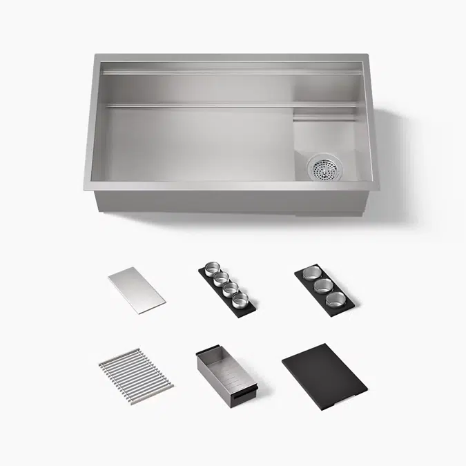 Experience the simple elegance, exceptional and luxurious quality, and sleek design of the KOHLER Synthos collection. Bring the art of culinary excellence into your home with this refined, multidimensional 33-3/4" workstation kitchen sink, designed to streamline your workflow, which offers an array of luxurious accessories for entertaining and cooking. This workstation is curated with the ultimate entertainer in mind with a cutting board, colander, and sink rack. A beautiful prep bowl set with three stainless steel cups and lead-free crystal glass lids can be used to prep, serve, and store, while a garnish bowl set, which includes four stainless steel cups with glass lids can be used for dips and sauces for sink-to-table enjoyment, plus easier cleanup.
