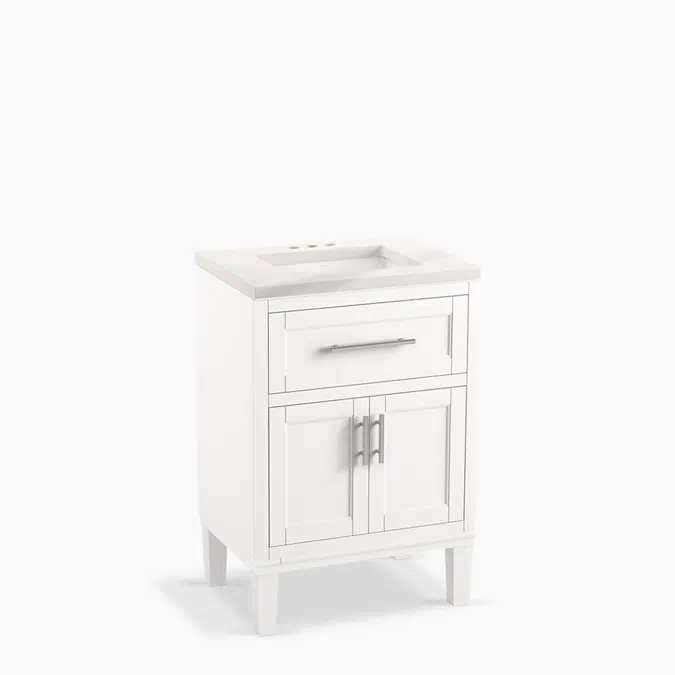 Inspired by eighteenth-century Shaker style furniture design, the Chesil bathroom vanity cabinet collection was fashioned with exacting lines to create a simple statement yet bridge the gap between commonplace and niche. Rail frame door and drawer panels, along with sharply squared cabinet pulls featuring subtle details, add a clean, crisp look. Vanity set includes cabinet, quartz countertop, sink, finish-matched legs, and Vibrant® Brushed Nickel hardware.