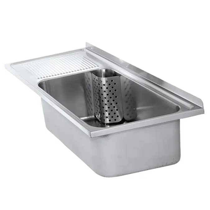General purpose sink for inset or wall mounting, stainless steel, surface satin finished, material thickness 1.2 mm, deep drawn seamless welded bowl, 1 1/2" waste with standpipe strainer, drain board with riffle, 40 mm rear upstand, wall mounting brackets optional. One bowl, drainboard left, width 1100 mm Dimensions 1100 x 357 x 550 mm (W x H x D) Bowl Dimensions 700 x 300 x 450 mm (W x H x D)
