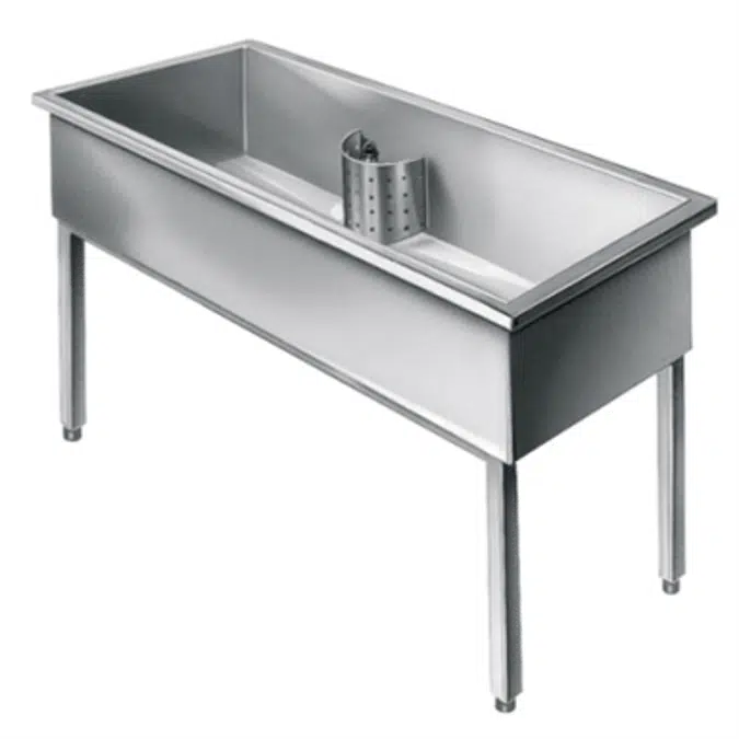 Workroom sink, stainless steel, surface satin finished, material thickness 1.2 mm, 38 mm waste fitting with 1 1/2" standing plug/overflow tube and strainer, with stainless steel square tube base frame, height adjustable. Width 1000 mm