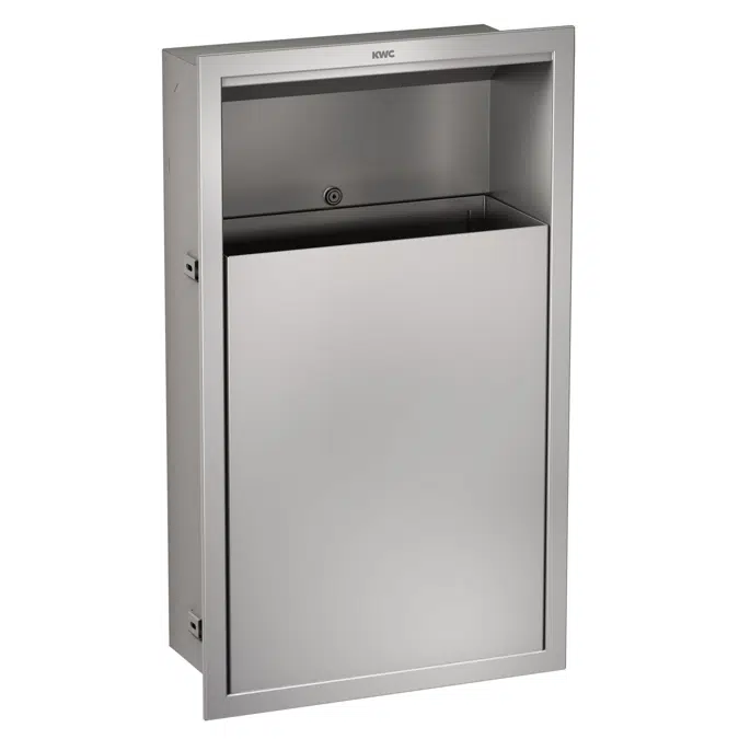 Waste bin for recessed mounting, stainless steel, surface satin finished, material thickness 0.8 mm, rounded edges, cylinder lock with Franke standard key, mounting with in-wall frame, includes stainless steel screws and dowels.