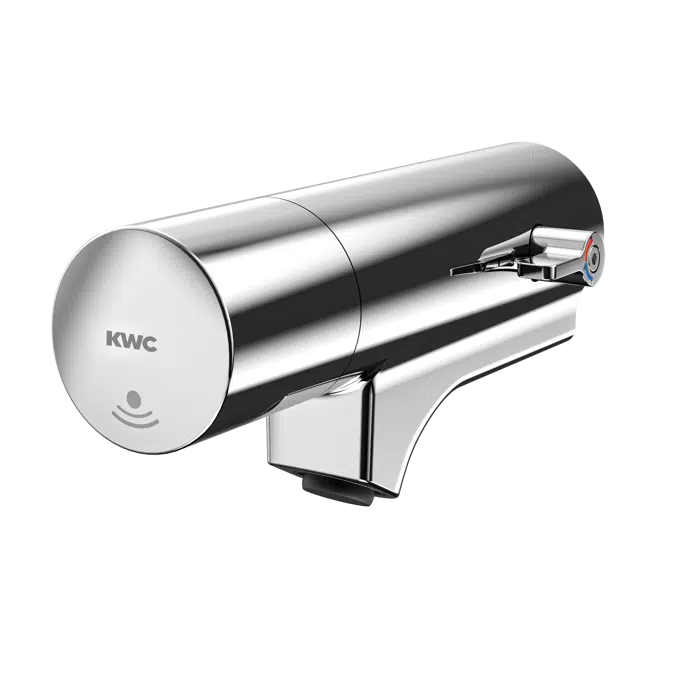 F5E-Mix Washbasin mixer DN 15 with angled outlet for installation on fitting units or separate wall flanges, for sanitary facilities. Opto-electronic control, activation on hand reflection. For connection to hot and cold water. Control electronics, solenoid valve cartridge, 6 V lithium battery (CR-P2) and sensor in all-metal housing, high-polished chrome-plated brass. Temperature lever with adjustable, turn-proof temperature stop. Anti-theft aerator, SLIM design, with integrated flow regulator 5.0 l/min. Connections positioned above one another with backflow preventers. Activated water hygiene flushing 24 hours after last activation, safety switch-off for continuous reflexion and saving of statistical data. With option for parameterization and communication via optional, bidirectional remote control.