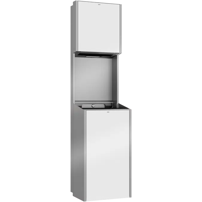 EXOS paper towel dispenser and waste bin combination for recessed mounting, stainless steel, surface satin finished, front white toughened safety glass, material thickness 1.2 mm, both parts with cylinder lock and key, paper towel dispenser capacity 300-400 pieces for paper with Z-fold, waste bin with approx. 30 litre capacity, integrated bag holder, including mounting material.