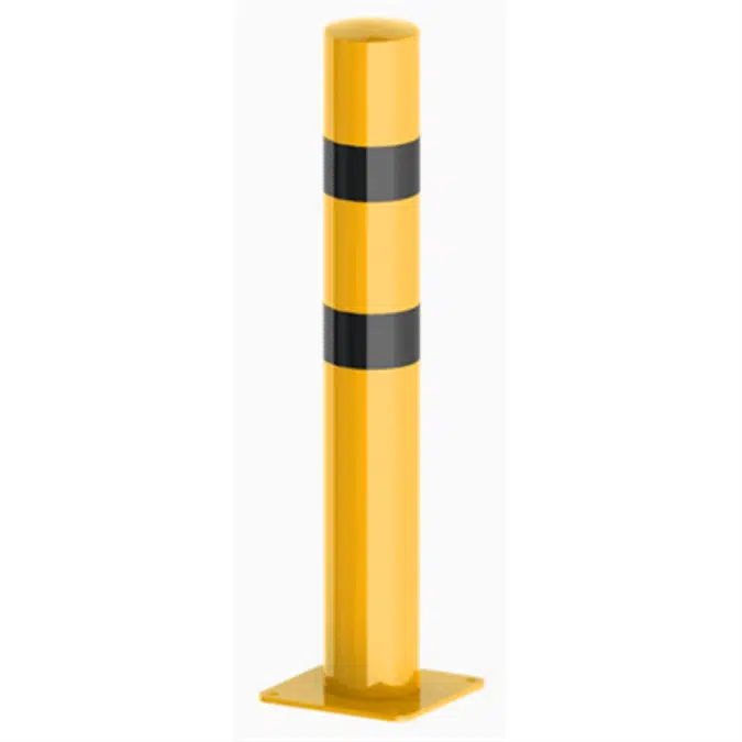 • Safety bollards are made out of a galvanised metal tube and finished in a bright yellow colour (RAL 1023). At the top, the bollards poles are finished with a rounded convex cover welded to optimise the drainage of water. The safety bollards are available as built-in and as a surface mounted model. This model is provided with a footplate, which is provided with four mounting holes.