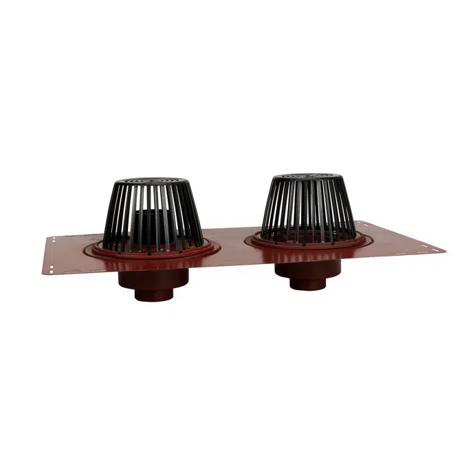 MIFAB® R1270 Series Combined Large Sump Roof Drain and Secondary Overflow System, consisting of 24” x 42 “ galvanized sump receiver, two lacquered cast iron roof drain bodies with 15” diameter anchor flange, cast iron waterproofing membrane clamp rings with integral gravel stop, one 4” ABS overflow standpipe and two self-locking polyethylene dome strainers with a combined free area of 250 square inches.