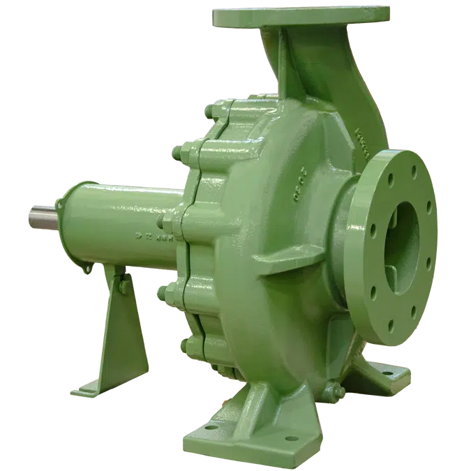 Bombas Centrífugas Horizontais Mancais, corpo espiral back pull-out bipartido, monoestágio, rotor fechado de fluxo radial, bocal de sucção e recalque flangeados, vedação do eixo através de bucha e selo mecânico, lubrificação do mancal de rolamentos através de óleo; atendendo às especificações técnicas da norma ISO 5199, dimensões conforme norma DIN EN 733.
