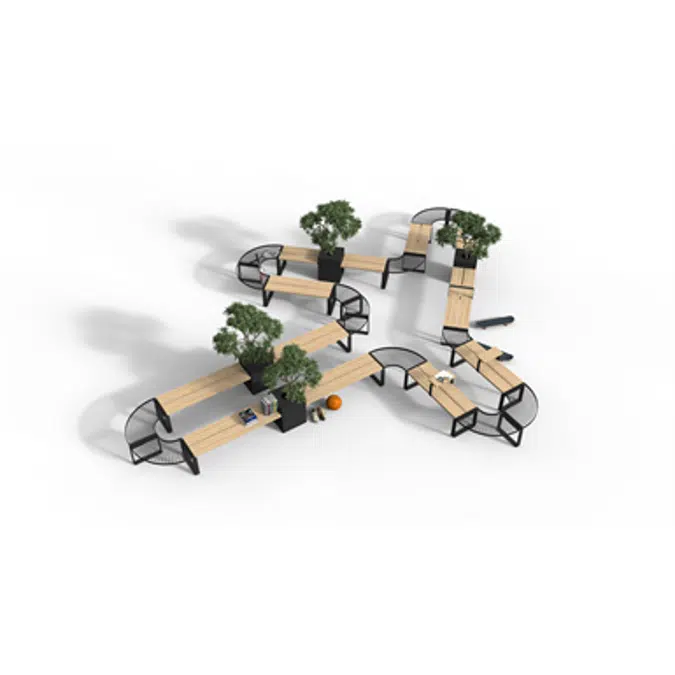 Bench and backed bench is available as a convex and concave 90° model in powder coated steel.