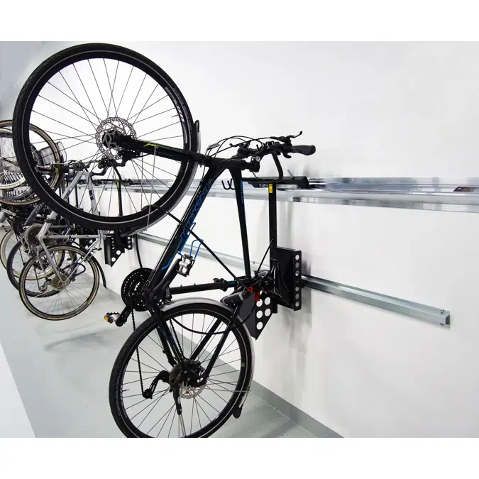 • Very effectiv system for storaging bikes vertically. You can park 10 bikes in 3 cubic meters (3 m²) at the wall.