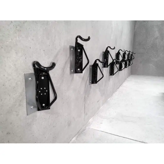 Wall hook for bicycles. Attachment from the front or rear tire. Installation on the wall or metal structures straight or diagonally and in pairs, down horizontally or up vertically.