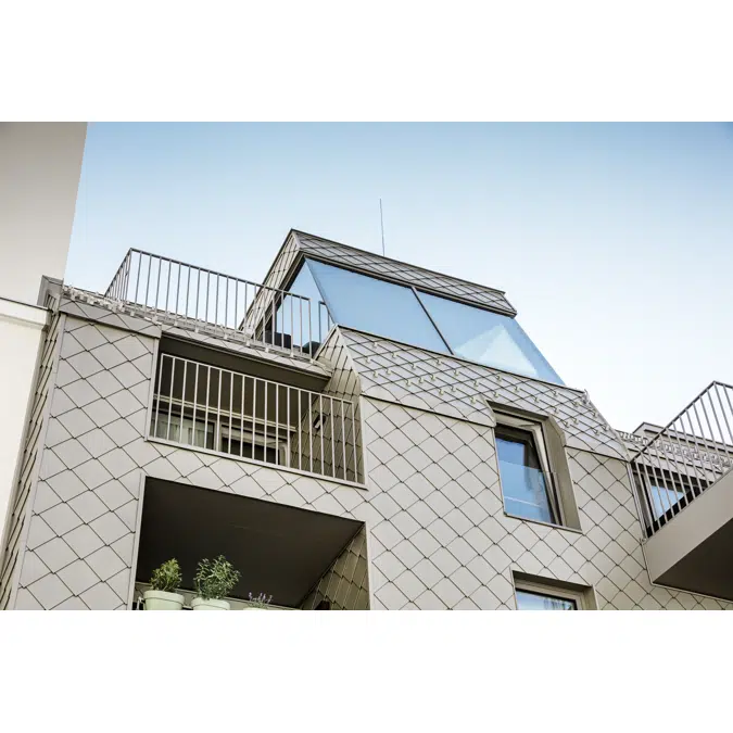 Den perfekta kombinationen av stil och funktion: Väggrombfasader präglas av ett harmoniskt spegel med ljus och skuggor – och är dessutom ytterst robusta. PREFA väggromb 29 × 29 är den mellanstora versionen av den populära fiskfjällsstilen för fasaden
