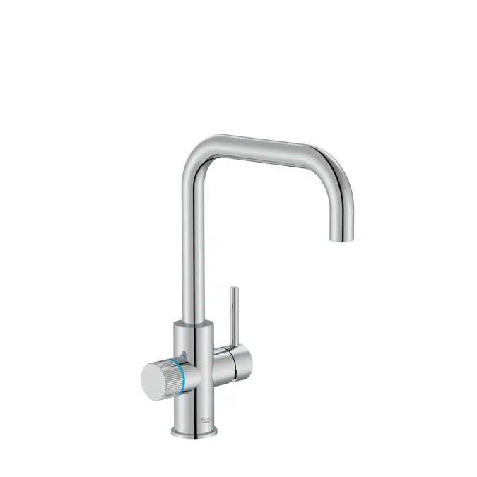 Kitchen sink mixer with 2 ways for filtered water and tap water, swivel spout and flexible supply hoses. Cold Start. Roca's Kitchen Filtration System offers a safe, convenient, and sustainable solution for better tasting drinking water. With easy installation under the sink, the collection includes a variety of faucets with three designs and three finishes, each equipped with a five-stage filter. An LED light provides a timely alert when the filter requires replacement.