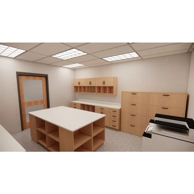 Commonly found in corporate offices, educational facilities, and professional services environments, the space centralizes copying, faxing, scanning, and document sorting into a compact, highly functional layout.The room features perimeter casework with integrated sorters, drawer storage, and upper cabinets to keep paper, supplies, and files easily accessible. Central worktables provide ample surface area for collating, organizing, and preparing documents, while dedicated copy machine zones ensure proper clearances for equipment and maintenance. A conveniently located paper recycling bin reinforces sustainable workplace practices without interrupting workflow.Built as a BIM-ready Revit model, this space includes accurate Revit families for casework, worktables, and office equipment, allowing architects and designers to quickly adapt the layout to different footprints or operational needs. The model supports efficient documentation, coordination, and visualization, making it ideal for workplace planning, renovations, or standardized corporate interiors.