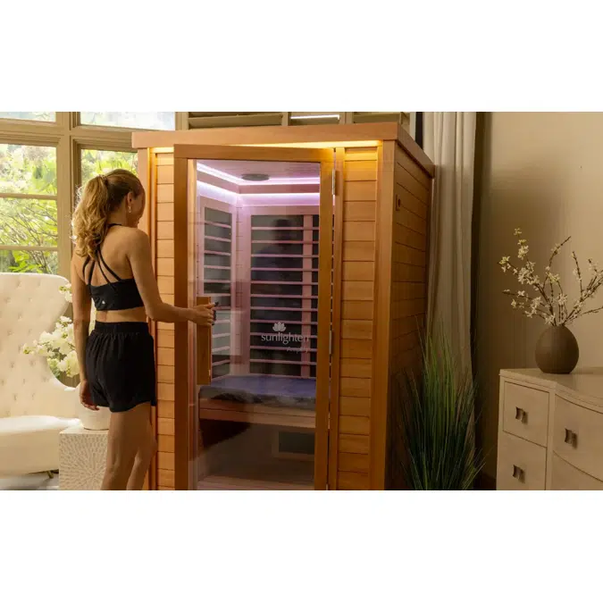 • EXTERIOR Width: 50.9" Depth: 45.9" Height: 77.7" includes 2" feet Door opening: 28" Recommend 4" between sauna and wall and 12" above sauna WEIGHT Basswood weight: 456 lbs. Eucalyptus weight: 541 lbs. HEATERS 5 Far Infrared 3 Full Spectrum ELECTRICAL 120V 2270W 18.92A NEMA 5-20 Dedicated 120V 20A circuit and outlet required COLOR OPTIONS Eucalyptus Ultra-premium appearance Long lasting and durable Sustainable/green/renewable Basswood Contemporary aesthetic Hypoallergenic FSC-certified