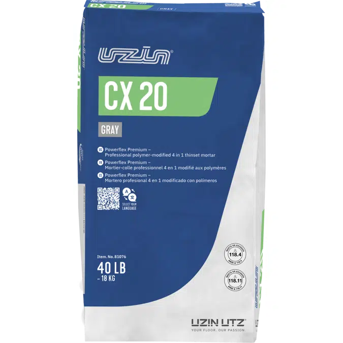 UZIN CX 20 is a professional quality, Portland cement-based, polymer modified non-sag mortar for the installation of most large format porcelain, ceramic, quarry, glass, mosaic and natural stone in interior & exterior conditions. UZIN CX 20 can also be used for applications involving uncoupling membranes and UZIN waterproof membranes.