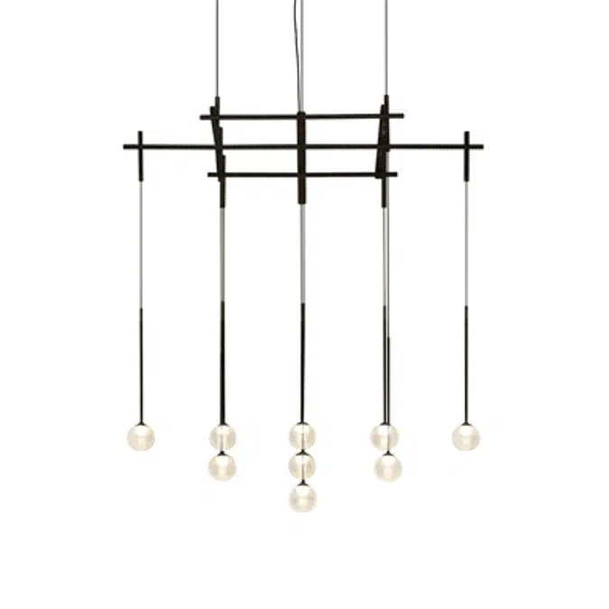 Pendant light fitting designed by Toan Nguyen. Composed of a collection of hand blown glass spheres with LED light source suspended at different heights, anchored to the ceiling via a floating tubular structure.
