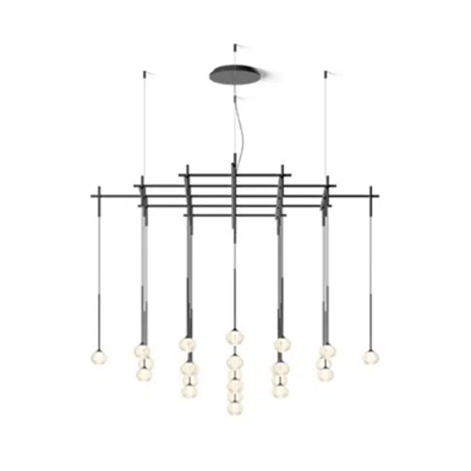 Pendant light fitting designed by Toan Nguyen. Composed of a collection of hand blown glass spheres with LED light source suspended at different heights, anchored to the ceiling via a floating tubular structure.