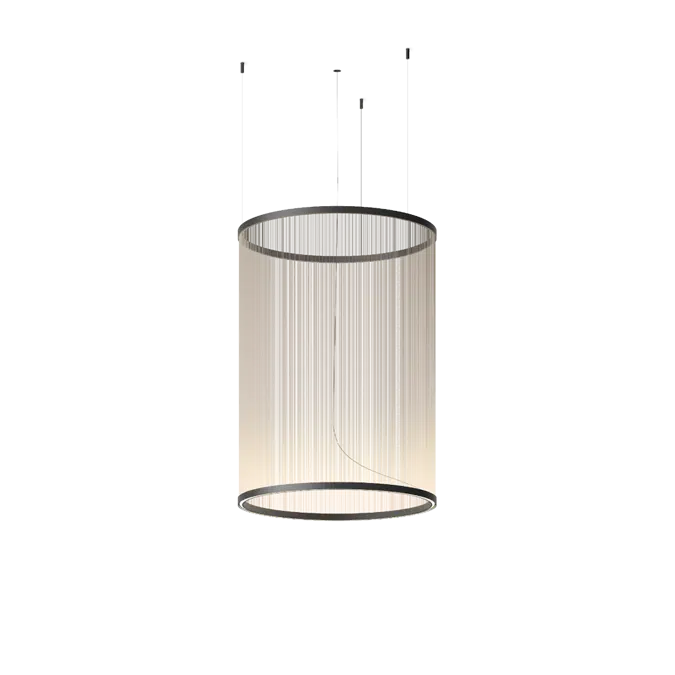 The Array pendant lamp includes a series of technical filaments that are pulled taut between two rings through which the light rises creating a colour gradient. The cylindrical shape and intimate size make it perfect for small scale spaces.