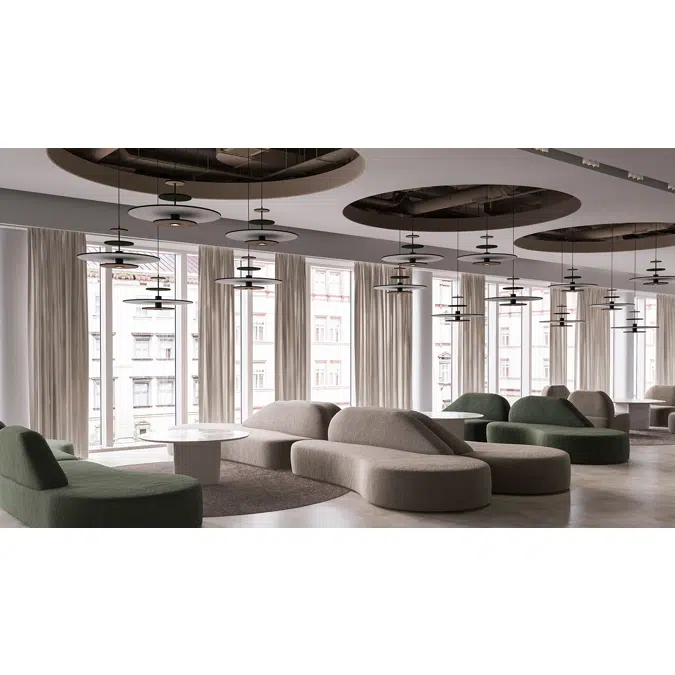Painted metal in black RAL 9005. Soundabsorbing slices made of polyester and bi-component fibre. Fabric Hush/Gabriel. Can be ordered with 2-, 3-, or 4-layer slices. Minimum 2 slices position A + B have to be ordered. The slices are two-coloured, one colour on each side.
