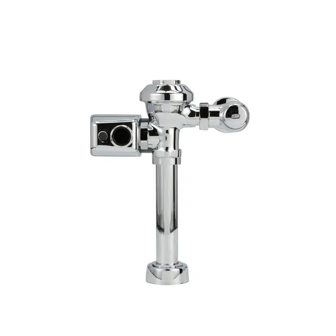 Exposed, quiet diaphragm-type, chrome plated flushometer valve with a polished exterior. Complete with Zurn's AquaVantage TPE, chloramine resistant, dual seal diaphragm with a clog resistant, triple filtered by-pass. The unit features a 6VDC motor actuator with automatic infrared sensor, user-in view L.E.D., low battery indicator light, switchable 24 hour auto-flush and three second delay flush to deter false flushing, 10 degree angled sensor for optimum user detection, courtesy flush button, high impact resistant polycarbonate housing, impact resistant glass lens and chrome plated metal cover. The unit comes complete with 4 "C" size batteries, wrench for installation and allen key for the battery compartment. The E-Z Flush electronics are ultra energy efficient for optimal battery life. This unit incorporates a high back pressure vacuum breaker, one piece hex coupling nut, adjustable tailpiece, spud coupling and flange for top spud connection. Control stop has internal siphon-guard protection, vandal resistant stop cap, sweat solder kit, and a cast wall flange with set screw. Internal seals are made of chloramine resistant materials.