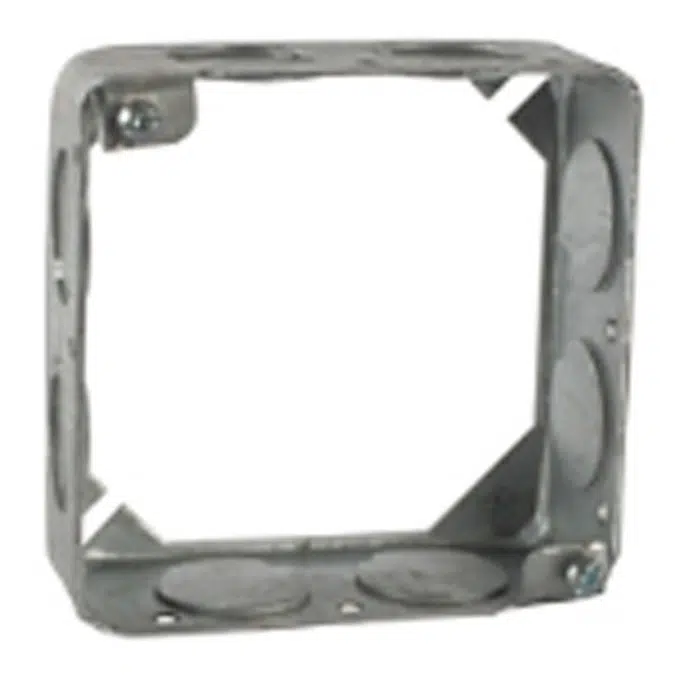 Anneau d'extension de boîte carrée en acier pré-galvanisé de 4 pouces, 1-1/2 pouce de profondeur, 21 cuin. Construction étirée avec débouchures de 3/4 de pouce.
