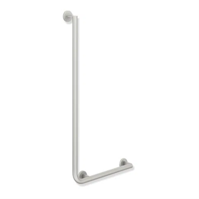Barre de maintien coudée, système 900 - barres verticales et horizontales, assemblées à angle droit, avec des rosaces de fixation - version gauche - longueur horizontale 500 mm, verticale 1000 mm, profondeur 87 mm - diamètre des barres 30 mm, épaisseur de la barre 2 mm, diamètre des rosaces 70 mm - en acier inoxydable de haute qualité, doté d'un revêtement en poudre dans les couleurs HEWI DX (blanc mat profond), DC (noir mat profond), AY (gris clair nacré mat profond) et SC (gris foncé nacré mat profond) - avec matériel de fixation anti-corrosion et certifié HEWI pour le montage mural et bande d'étanchéité pour étanchéifier les points de perçage - répond à la norme SIA 500 No. de référence: HEWI 900.22.13860