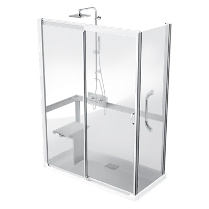 Panneaux de fond en verre blanc opaque Espace à porte coulissante Receveur extra-plat 3 cm pour un accès sans effort Douchette à main en laiton avec flexible anti-torsion et douche pluie 2 finitions de verre : transparent ou avec une bande centrale dépolie