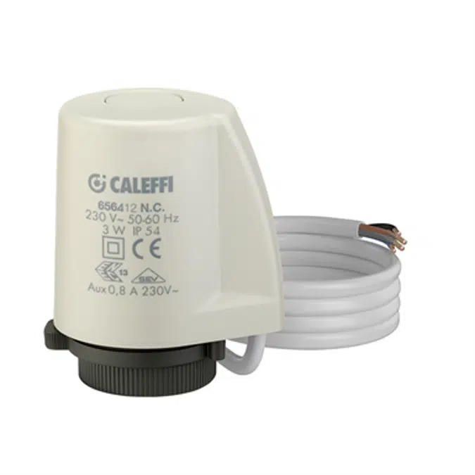 • The thermo-electric actuator, mounted to a zone valve or manifold, allows automatic shut-off of the medium under the control of a room thermostat or electrical switch. The 6564 series features low current draw, ideal during the start-up phase. It is equipped with a valve opening/closing indicator, and a quickcoupling system with a retainer clip adapter for easy installation. It features NEMA 5 protection allowing upside-down installation.