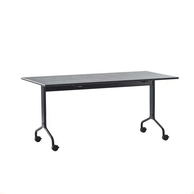 • The tabletop is made of veneered MDF, finished in oak, ash, birch, standard stains on ash, or white glaze on oak or ash. The centre beam and ends are of solid wood in the same finish as the top. The edge of the table top (straight as standard and D-kant for a supplement) will be the same finish as beam and ends. Table legs terminate in a metal foot with a finely textured powder lacquer finish in white (RAL 9016), black (RAL 9005) or grey (RAL9006/07). Each table is fitted with four black wheels that can be locked in place. Link fittings, table aprons and various electric outlets are available as optional extras. Tables equipped with electric outlets have cable ducts with a wooden finish, so cables can be kept in place under the tabletop when the table is folded for storage. The table is supplied unassembled. The leg frames are to be fitted to the central beam. If required, the table can be easily dismantled into its component parts using only simple hand tools.