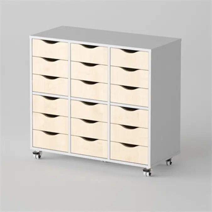 Esther storage series consist of several different modules on wheels or socket. All modules have a total height of 90 cm and a depth of 45 cm. Body of chipboard with laminate surface in three different colors: birch, light grey or white. The drawers have high pressure laminated fronts which come in 9 different colors.