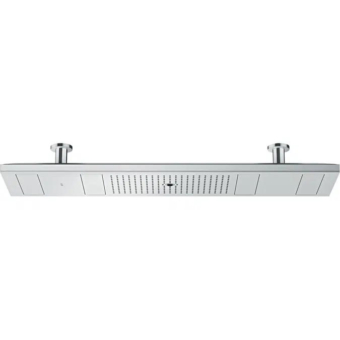 • Surfaces: - 10637000 Chrome - 10637020 Polished Chrome - 10637130 Polished Bronze - 10637140 Brushed Bronze - 10637250 Brushed Gold Optic - 10637260 Brushed Chrome - 10637300 Polished Red Gold - 10637310 Brushed Red Gold - 10637330 Polished Black Chrome - 10637340 Brushed Black Chrome - 10637800 Stainless Steel Optic - 10637820 Brushed Nickel - 10637830 Polished Nickel - 10637930 Polished Brass - 10637950 Brushed Brass - 10637990 Polished Gold Optic Specification: • shower head size: 1200 x 300 mm • spray type: PowderRain, Rain, Mono • Select button on thermostat • material spray disc: metal • brass ceilling connector • ceiling connection length: 100 mm • maximum flow rate at 3 bar: 30 l/min • flow rate Rain spray (at 3 bar): 16 l/min • flow rate Mono spray (at 3 bar): 14 l/min • minimum flow pressure: 3 bar • spray types can be activated individually or in combination • overhead shower removable for cleaning • extendable flaps can be opened manually • installation: ceiling, extendable claps can be pre-set to the user size • connection dimension: DN15 • connection type: basic set • not suitable for continuous flow water heaters • TÜV certified