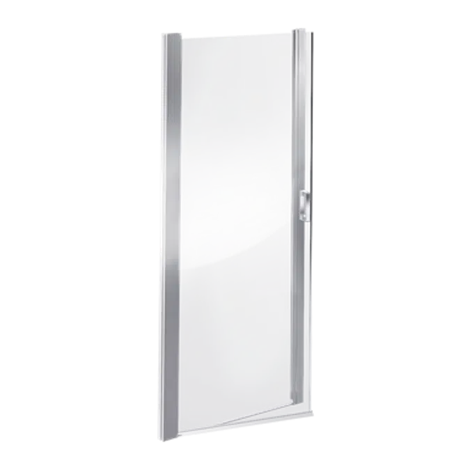 Porte pivotante (intérieur/extérieur) sans seuil + paroi fixe d'angle Verre 6 mm 2 finitions de verre : transparent ou sérigraphié 2 finitions de profilé : blanc ou chromé Poignée métallique assortie aux profilés Obturateurs pour une finition parfaite Ouverture totale : grâce aux profilés pivots Ouverture intérieure/extérieure à 180° Barre de seuil facultative pour une étanchéité améliorée