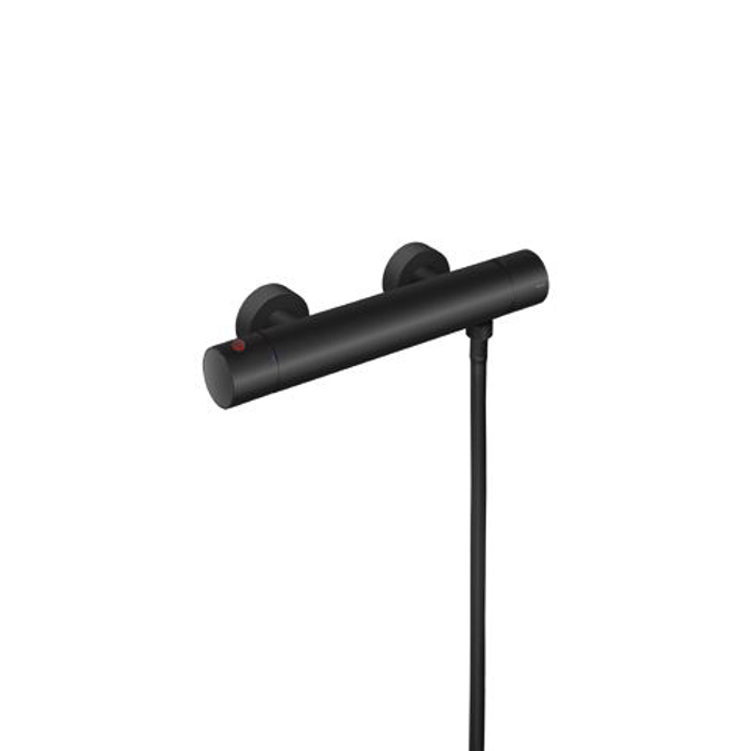 HEWI SAFE TOUCH douchethermostaat - mat zwart gepoedercoat, rond - kraanlichaam, bedieningselement en rozetten: messing - HEWI SAFE TOUCH veiligheidsbehuizing: het gehele kraanlichaam wordt niet heet - 12 l/min - beveiliging tegen verbranding: veiligheidsblokkering bij 38 °C - terugstroomblokkering in de wandaansluitingen - dynamische volumeregelaar 12 l/min in de doucheaansluiting - ingebouwde vuilopvangzeef - standaard doucheaansluiting G 1/2" voor gebruikelijke doucheslangen - warm-koud-markering - aansluittype: S-aansluitingen met ingebouwde geluiddempers, schuifrozetten - 48 mm hoog, 320 breed, uitzwenking: 108 mm - maat: 150 mm +/- 20 mm - geluidsklasse 1 - geschikt voor thermische desinfectie DVGW W 551