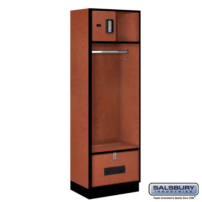 • Constructed of industrial grade particleboard and covered with durable high pressure laminate Ideal for sports facilities, schools, locker rooms, police and fire stations or wherever a professional environment is needed Available in a gray, blue, black, maple, cherry or mahogany finish and include a black name / number plate Units are 2 feet wide, 6 feet high (add 4" for base) and 18" or 24" deep Units feature 2 double prong coat hooks, a coat road and a 14" high foot locker with a hinged lid, a ventilated front panel and padlock hasp 14" high foot locker provides comfortable seating and secure equipment storage Units also feature an upper shelf with an 11" wide x 12" high top compartment The top compartment features a 12" wide x 3/4" deep door with heavy duty concealed hinges and a lift up handle and recessed hasp, resettable combination lock (black or silver finish), or electronic lock (black or silver finish) Salsbury Industries is an ISO 9001: 2015 certified company and has excelled in the field of manufacturing since 1936