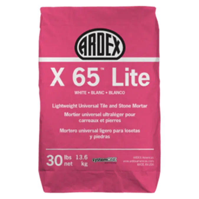 ARDEX X 65™ Lite is a versatile, high-performance lightweight mortar (30 lb. bag) delivering equal or better coverage than competitive 50 lb. bags. The easy-to-apply, creamy consistency is sag resistant and ideal for setting large format and heavy tile. ARDEX X 65 Lite can be used for setting porcelain, quarry, ceramic and most natural stone tiles.