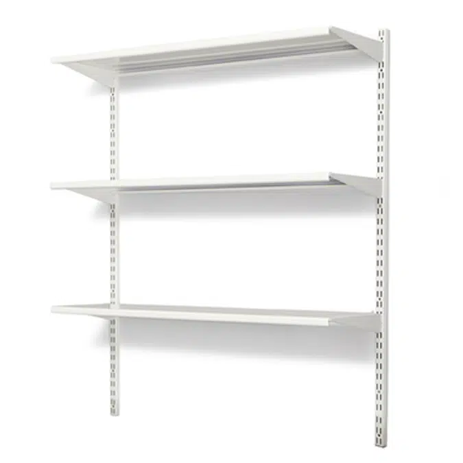 Sovella wallshelving system includes uprights, brackets and steel shelves. The parts are available in powder painted white (-21) and silver effect (-38). Sovella wallshelving system meets the high demands set for storage in public spaces in terms of durability and load capacity. A wide range of wire shelves, pull out baskets, cloth rails and racks as well as perforated panels and hooks are available and compatible with each other. The system includes also a free-standing unit.