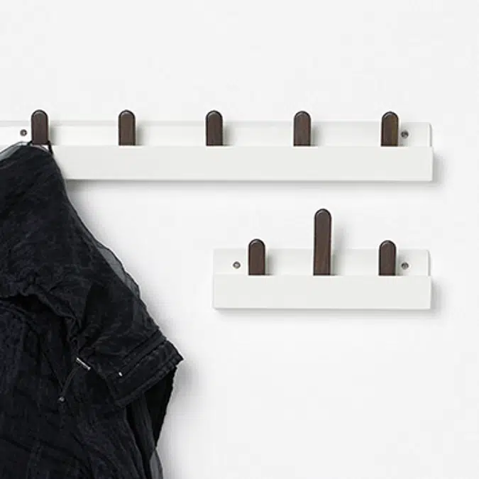 Front coat rack (Lasse Pettersson, Lennart Notman, 2004). Coat rack is available in lengths 250, 500, 1000, 1500 and 2000 mm and in solid oak, birch, standard colors and standard stains on oak. Hooks from 3 up to 20 in solid wenge wood. Secured directly to the wall. Special sizes and other finishes upon request.
