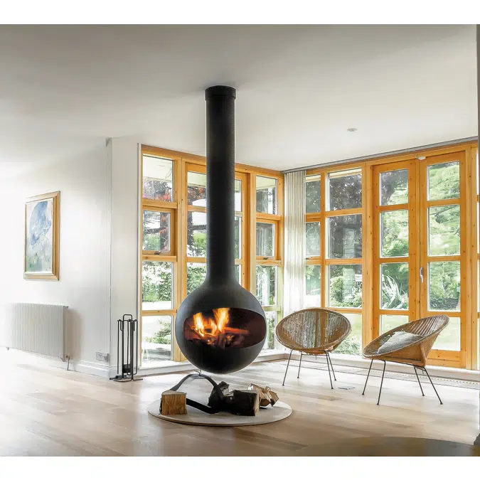 With a nod towards the sea, this round, compact, hanging fireplace has a serene, understated, and warm presence. This modern wood fireplace rotates 360 degrees so the fire can be turned to create drama and ambiance in any corner of the room.
