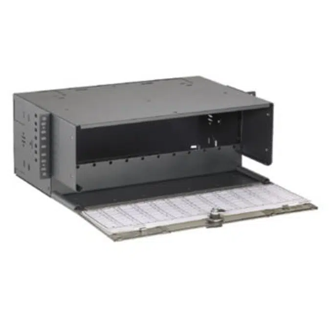 The Panduit® Opticom® Rack Mount Fiber Enclosure ensures network reliability by housing, organizing, managing and protecting up to 288 fiber optic cable, terminations, splices, connectors and patch cords using up to 12 FAP or FMP adapter panels. Because of this versatility, the enclosure is able to serve as a transition from backbone cabling to distribution switching, an interconnect to active equipment, or as a cross-connect or interconnect in a main or horizontal distribution area. Users can even easily access the fibers through a fixed bulkhead design. Steel, 4 RU, 12 ports, 6.62"H x 17.16"W x 11.80"D (87.6mm x 168.1mm x 299.7mm), Black, 1pc.
