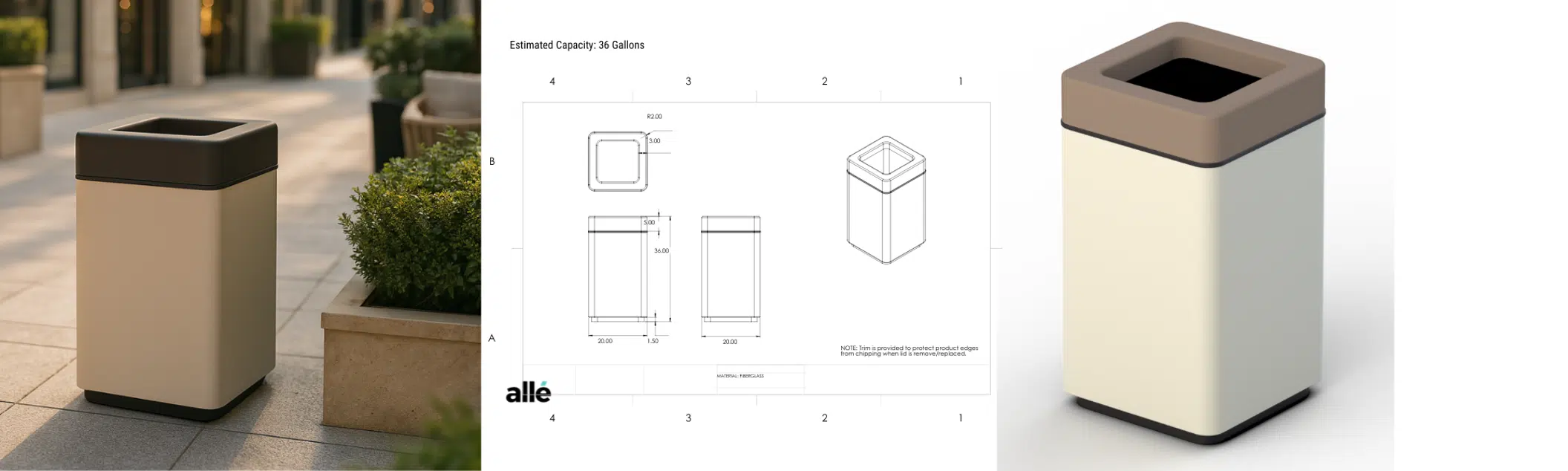 Allé Designs partnered with one of the largest malls in the United States by total square footage and the largest mall in both Florida and the Miami metropolitan area. Together, we developed a custom dual-finish fiberglass receptacle that seamlessly integrates architectural intent with everyday functionality.