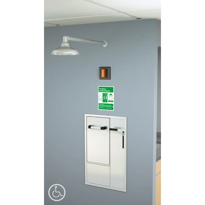 Application: Recessed barrier-free eye/face wash and shower safety station for use in cleanrooms. Unit is constructed in Type 316 stainless steel for superior corrosion resistance and meets cleanroom requirements, making it ideal for use in semiconductor, electronics, pharmaceutical and washdown applications. Unit has wall mounted exposed shower head and drain pan. Stainless steel cover provides attractive appearance and protects unit when not in use. When activated, cover serves as pan to collect waste water and return it into unit for drainage.