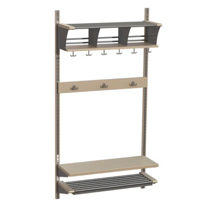 Our simplest and most competitive system, designed for general use. Strong, simple and flexible, it is often used for material storage. However, with a little bit of imagination, it can find its way into more sophisticated interiors. The shelves and other metal parts are available powder coated in Hylltekniks colours: T1-white, T2-grey, T3-dark grey , T4-black, T5-metallic paint, T6-purple red, T7-sapphire blue, T8-pine green, T9-aluminium, T10-red, T11-green eller T12-blue. The shelving system is also available in galvanized and stainless steel. Hylltekniks components for cloakroom is avaliable in beech, birch and oak. For more information about the products visit our website.