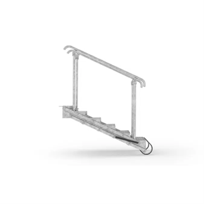 Fälltrappan, som är ledad, består av ett antal gallerdurkssteg med parallella vangstycken, gummiklädda stödbågar, räcke på båda sidor samt fästen. Två stycken dämpare på sidan gör bryggan lätthanterad. Fälltrappan levereras hopmonterad.