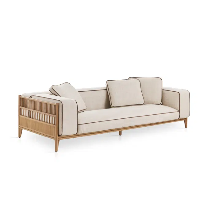 Sofa with structure made of peeled and tinted natural rattan of 32 mm/1.26” diameter. Backrest and sides manufactured in peeled and tinted natural rattan of 10 mm/0.4” diameter. Finished with a three step water-based coating (dye, base coat and top coat) highly resistant to solar radiation thanks to UV filters. Possibility of customization through a wide variety of fabrics. Protective caps.
