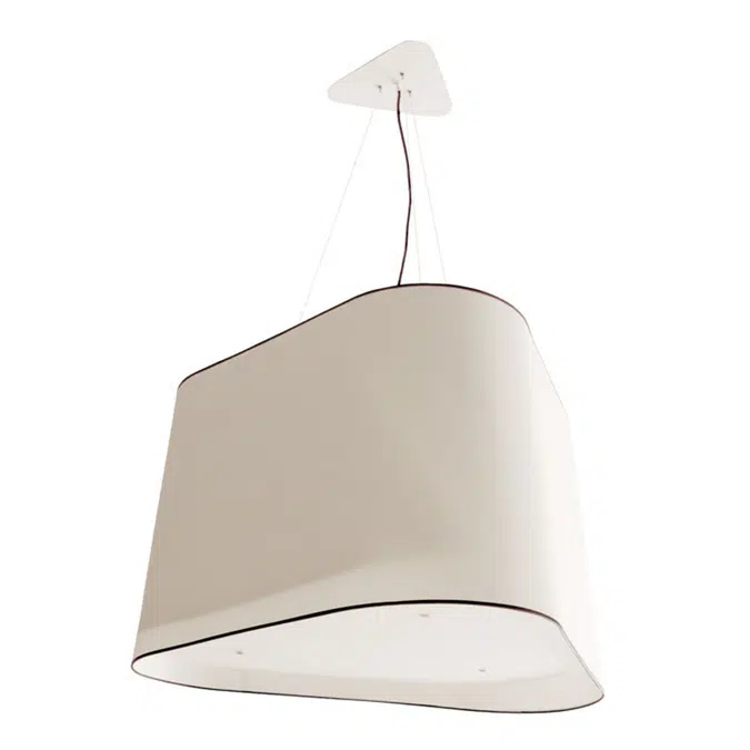 The XXL Nuage pendant is ideal for main lighting in all types of space, but particularly in large areas. For a comfortable diffusion of light, this very large suspension is fitted with an inner diffuser in satin opal acrylic. It consists of a voluminous shade in diffusing white fabric edged with black braid at the top and bottom, suspended by a decorative black textile cord and three steel cables that are fixed to the ceiling on a white lacquered triangular steel hook. The Nuage collection, made entirely in France, has a timeless, universal design with a rounded, triangular shade that resembles the prow of a boat.