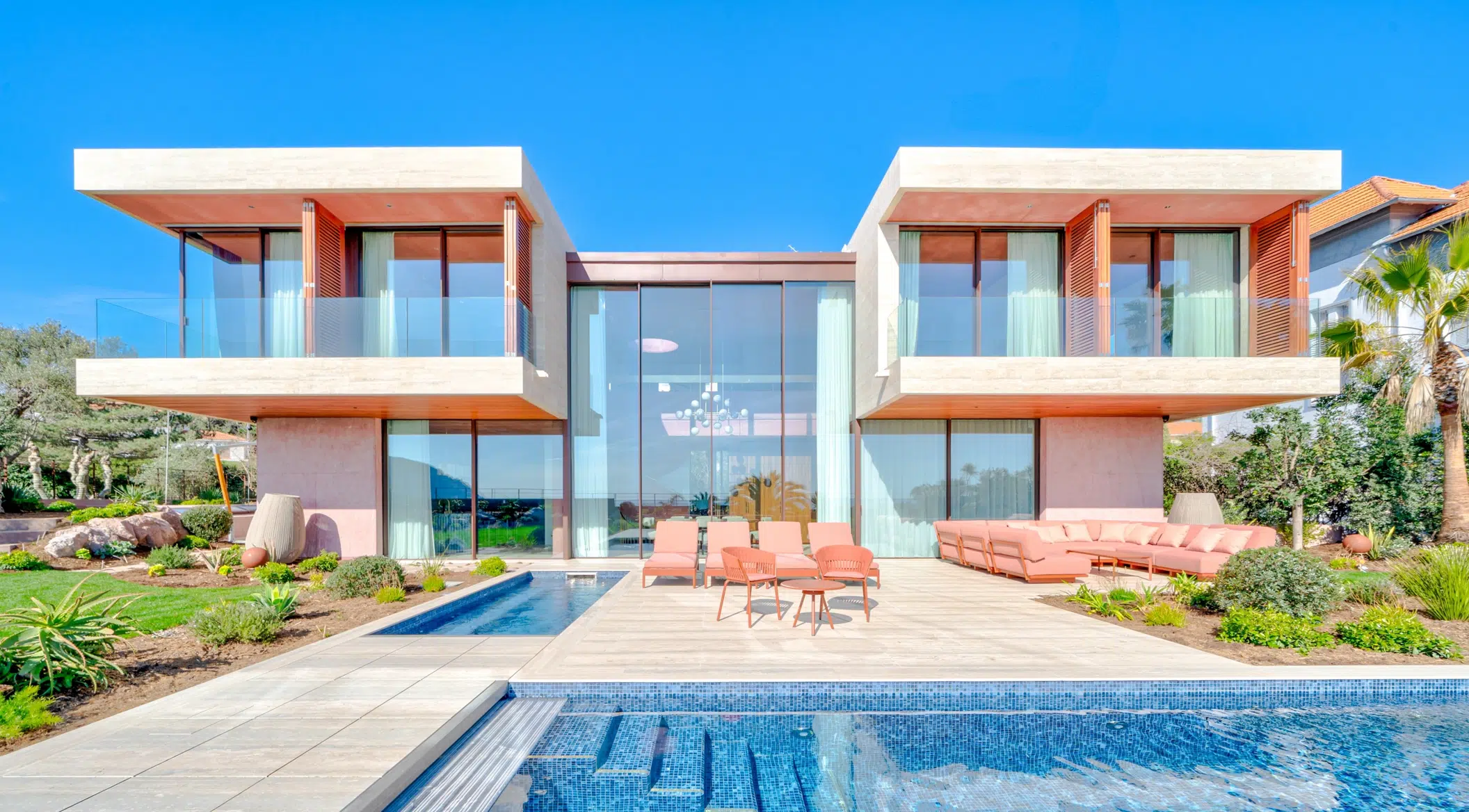 With nearly 100 m² of glazing, each opening becomes a living frame of the red rock of the Esterel mountains, the sea, and the sky.