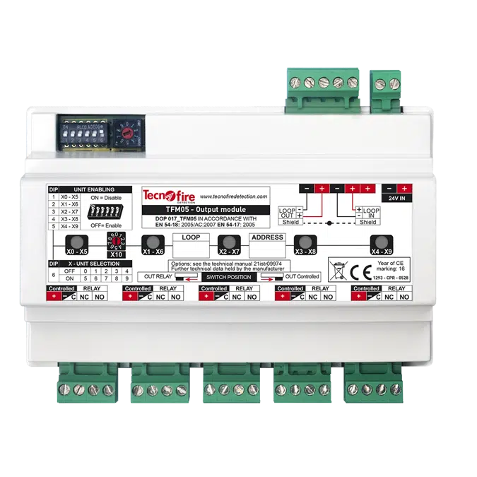 • The TFM05-HP is an addressable module composed of 5 supervised physical/logical units: 5 outputs. Programmable functions: 2 functioning modes (acknowledgeable, nonacknowledgeable), 2 output types (contact, controlled output), output activation delay, output activation time, output activation can be subjected to formula – Protected power supply input for load – 5 output status LED – Integrated RSC® technology: programming, remote management of all functioning parameters – Dual loop isolator – Connection to loop – Proprietary high-speed protocol Fire-Speed – Mounting on the surface or DIN rail TFDIN – IP40 – Casing ABS V0 – Dimensions (L x H x D) 144 x 92 x 71.5mm – White color - EN 54-18: 2005/AC: 2007 – EN 54-17: 2005 - Certification number 1293-CPR-0528